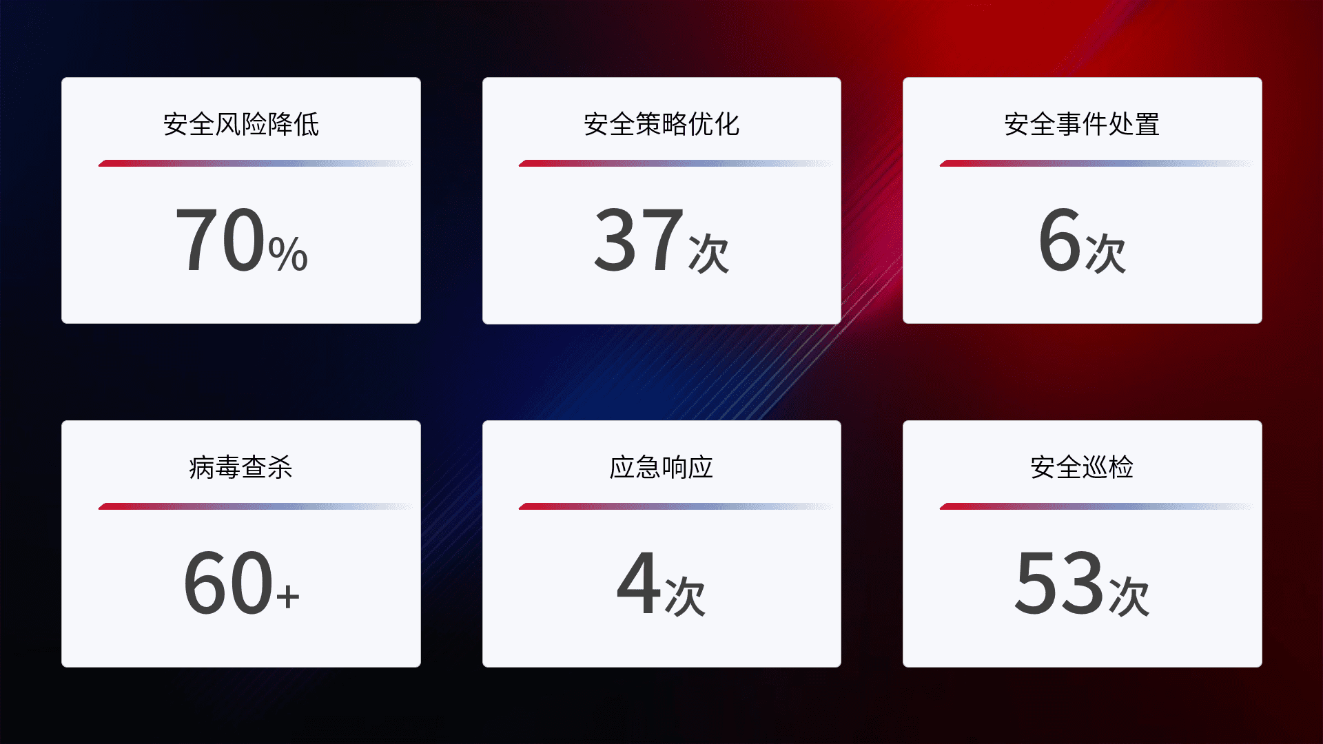 提供全面的安全事件报告体系,,包括处置报告、、周报、、、季度和年度总结,,结合持续监控,,,,帮助客户深入了解网络安全状况。。。