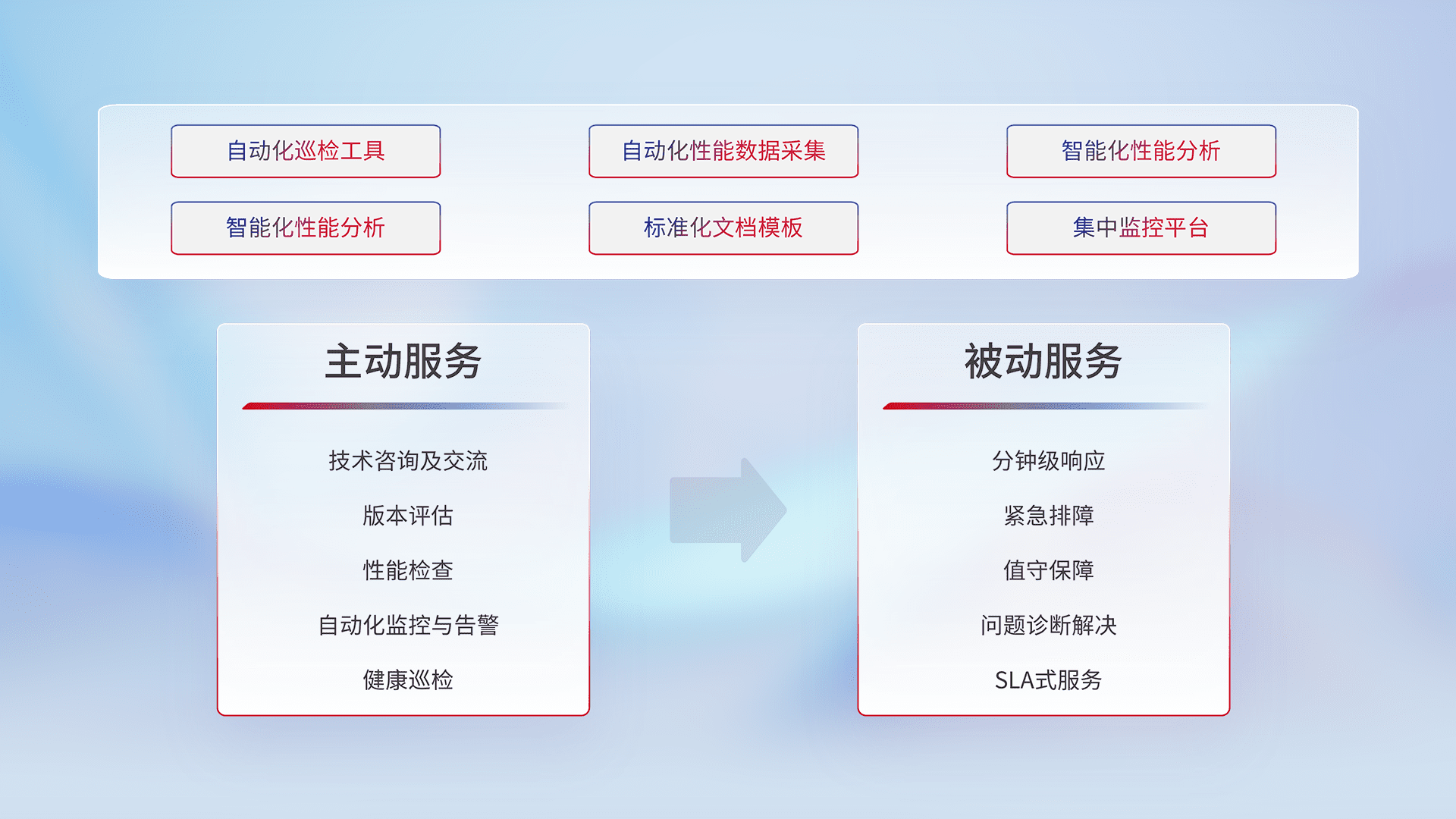 智能化工具和标准化文档,,,,保障服务质量,,,,提供主动服务(包含技术咨询、、、、版本评估、、、、性能检查、、、自动化监控与告警、、健康巡检)和被动服务包含(分钟级响应、、、紧急排障、、、、值守保障、、问题诊断解决、、SLA服务)。。。